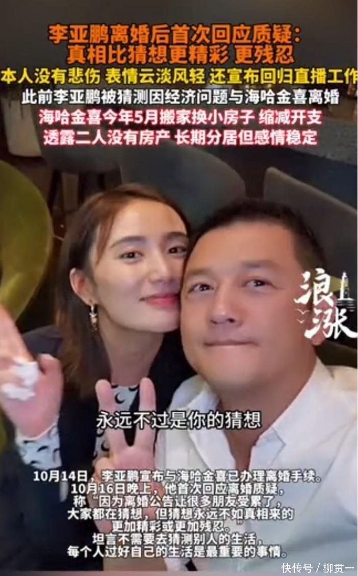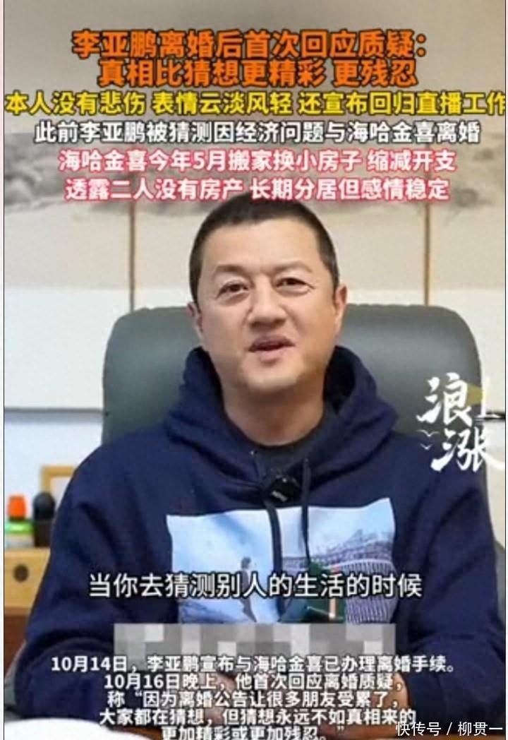 10号晚上,李亚鹏总算对离婚的事儿开口了——这是他和海哈金号发联合声明官宣离婚后,头一回正面回应。他说“猜想永远不如真相来得更精彩或更残忍”,还补了句“别猜别人的生活,过好自己的最要紧”,脸上看着没半点悲伤,顺带提了句要回去搞直播干活儿。